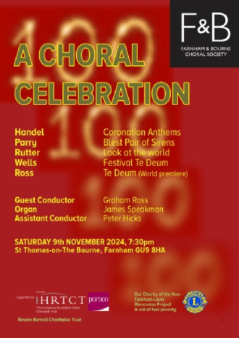 Ninety seven members of the Farnham & Bourne Choral Society sang in its Remembrance concert on Saturday 9th November at St. Thomas-in-the Bourne. The church had a capacity audience of 250, ranging in age from the single to the nearly triple figures. Judging by audience comments, the varied first half programme was a particular hit. It opened with Handel’s rousing chorus Zadok the Priest, followed by Mozart’s Eine kleine Nachtmusik, sensitively conducted by Robin Wells, and played by the 22-piece orchestra led by Sally Dewey. Mendelssohn’s short Prayer for Peace preceded another choral work by Handel. This was an arrangement of Eternal Source of Light Divine, from the Ode for the Birthday of Queen Anne, for solo soprano (beautifully sung by the pure voice of Jenny Sanders) and solo trumpet (played from the organ loft by Will Spencer). Due to its popularity, this item had been included for a second consecutive year.